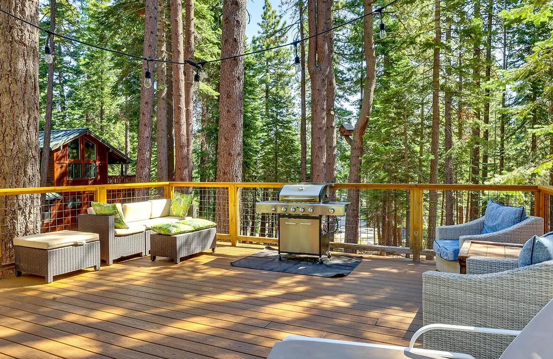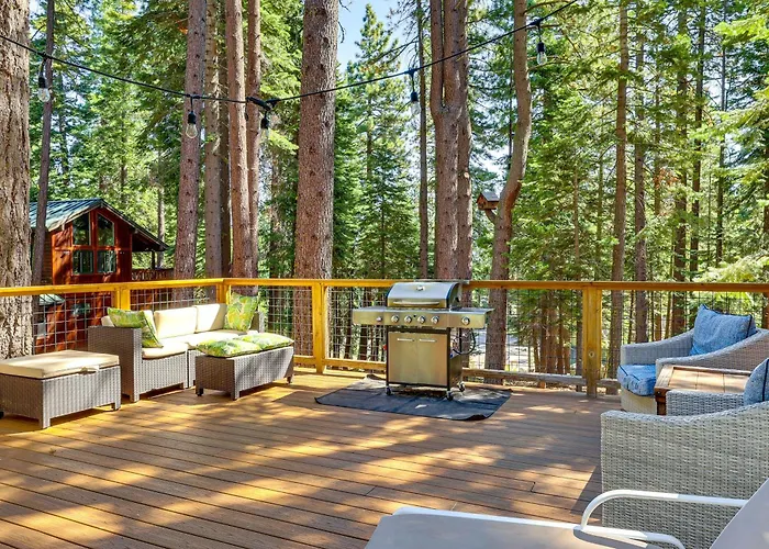 De 5-slaapkamer Forest-View Haven With Game Room Tahoe City Gem! villa ligt op 3 km van Truckee River Bike Trail en biedt toegang tot verschillende attracties in de omgeving.